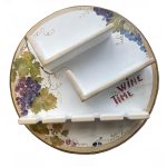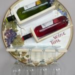 Suport rotund de agatat pe perete pentru aranjarea a doua sticle de vin si 4 pahare. Acesta este realizat din lemn cu diametru de 50 cm, adancime polita 10 cm. Produsul este pictat si patinat manual in atelierul Suba Decor,,avand tematica la pictura vita de vie cu struguri. Spatele suportului este prevazut cu sistem de agatare rezistent la greutate, pentru prinderea acestuia pe perete.