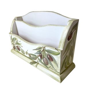 Suport pentru tacamuri si servetele confectionat din lemn, patinat si pictat cu margarete. Ideal pentru bucatarie, de pus pe masa pentru servire. Dimensiunile sunt de 20x18x14cm. Cu aspect elegant și atrăgător.
