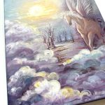 Tablou pictat manual cu unicorn si peisaj fantastic. Are dimensiunile de 30 x 40 cm, si este realizat pe panza. O singura piesa unica disponibila. Se infatiseaza un unicorn in peisaj de iarna, privind catre rasaritul soarelui.
