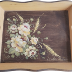 Tava din lemn dreptunghiulara, pictata manual cu trandafiri galbeni si patinata cu brun. Datorita bordurii care ofera stabilitate, tava se poate folosi pentru servit cafea, ceai sau desert.