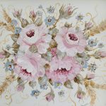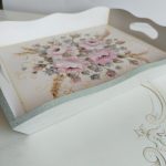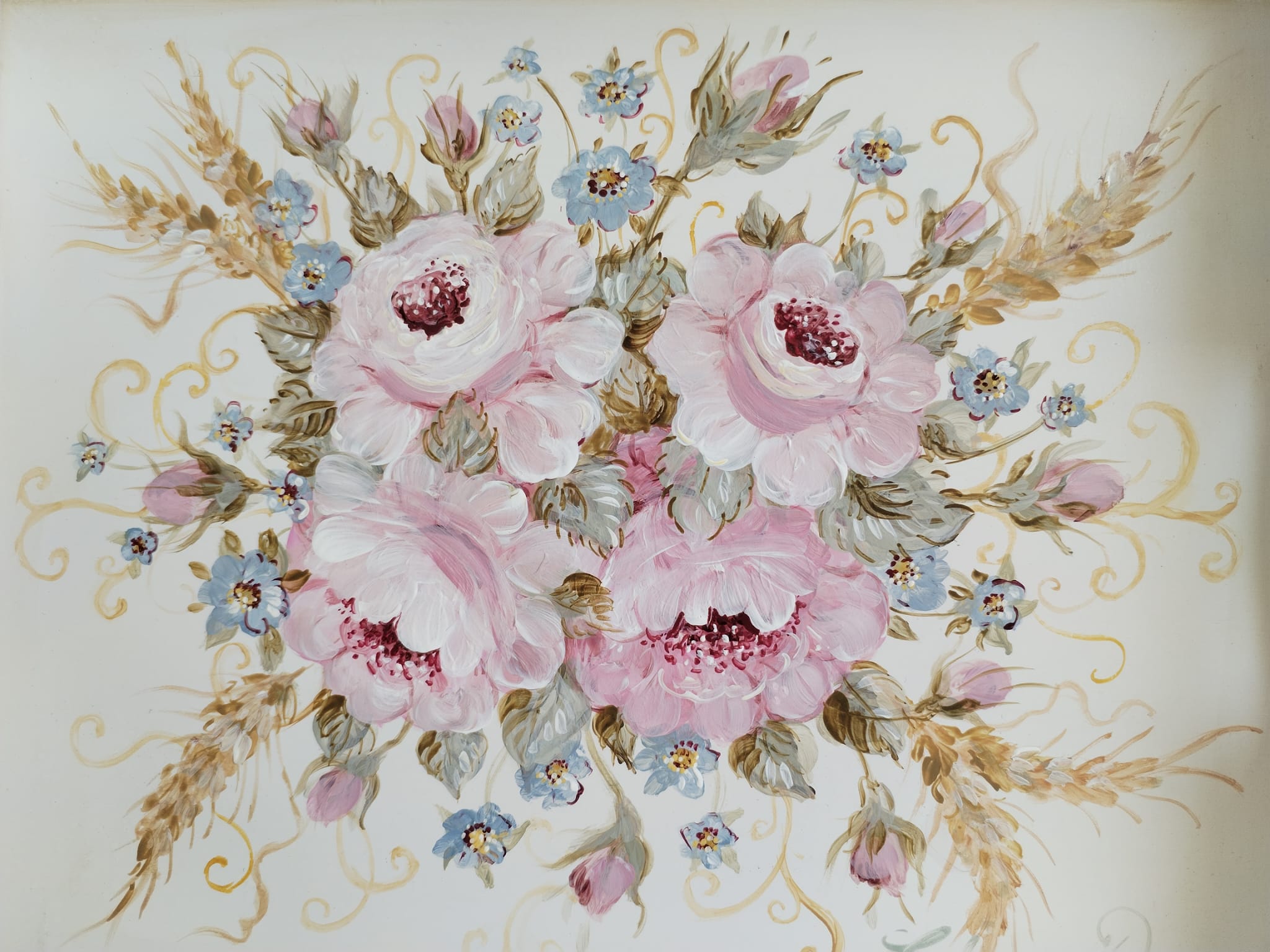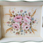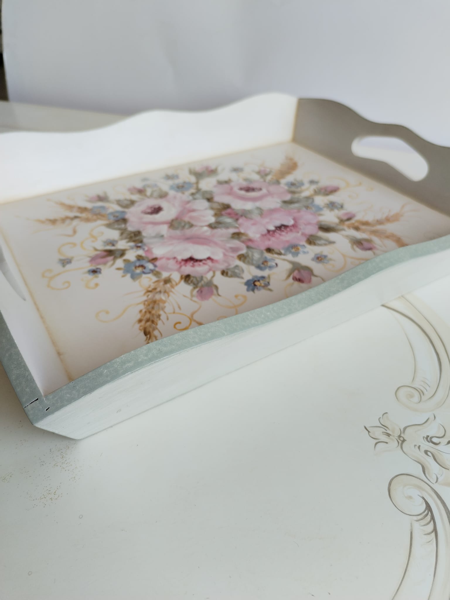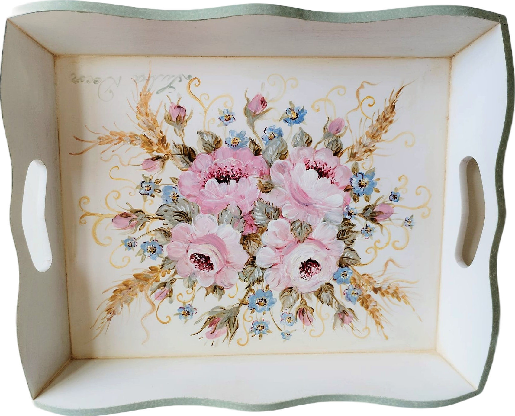 Tava dreptunghiulara din lemn, patinata si pictata manual cu trandafiri roz pastel, albastrele si spice de grau. Datorita bordurii care ofera stabilitate, tava se poate folosi pentru servit ceai, cafea sau desert.