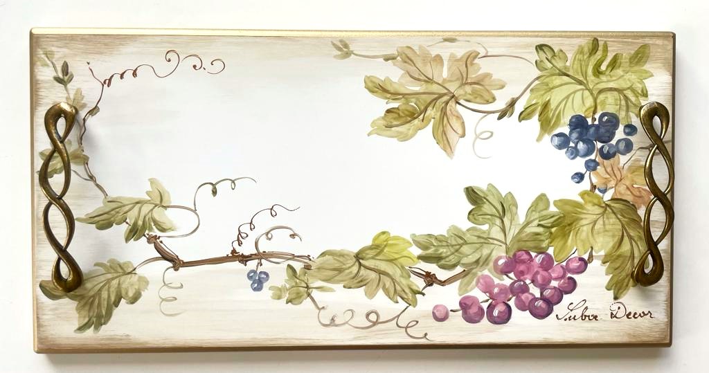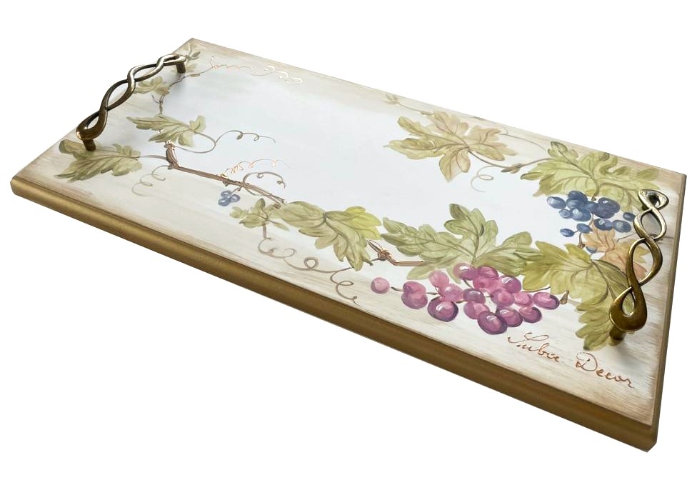 Tava dreptunghiulara din lemn pictata cu vita de vie . Produs Suba Decor cu dimensiunea de 50-25cm. Totul este patinat si antichizat manual cu culori pe baza de apa izolate la final . Este obiectul ideal pentru decorarea sau servirea mesei . Se poate darui ca si cadou perfect .