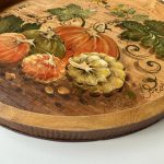 Această superbă tavă rotundă cu bordură aduce farmecul toamnei direct în casa ta. Pictată manual cu dovlecei și finisată cu o patină subtilă, această tavă este o piesă de artă și utilitate într-un singur obiect. Este mai mult decât doar o tavă, este o expresie artistică a sezonului de toamnă. Poate fi folosită pentru servirea mesei, prezentarea gustărilor sau ca piesă în decorul de masă.