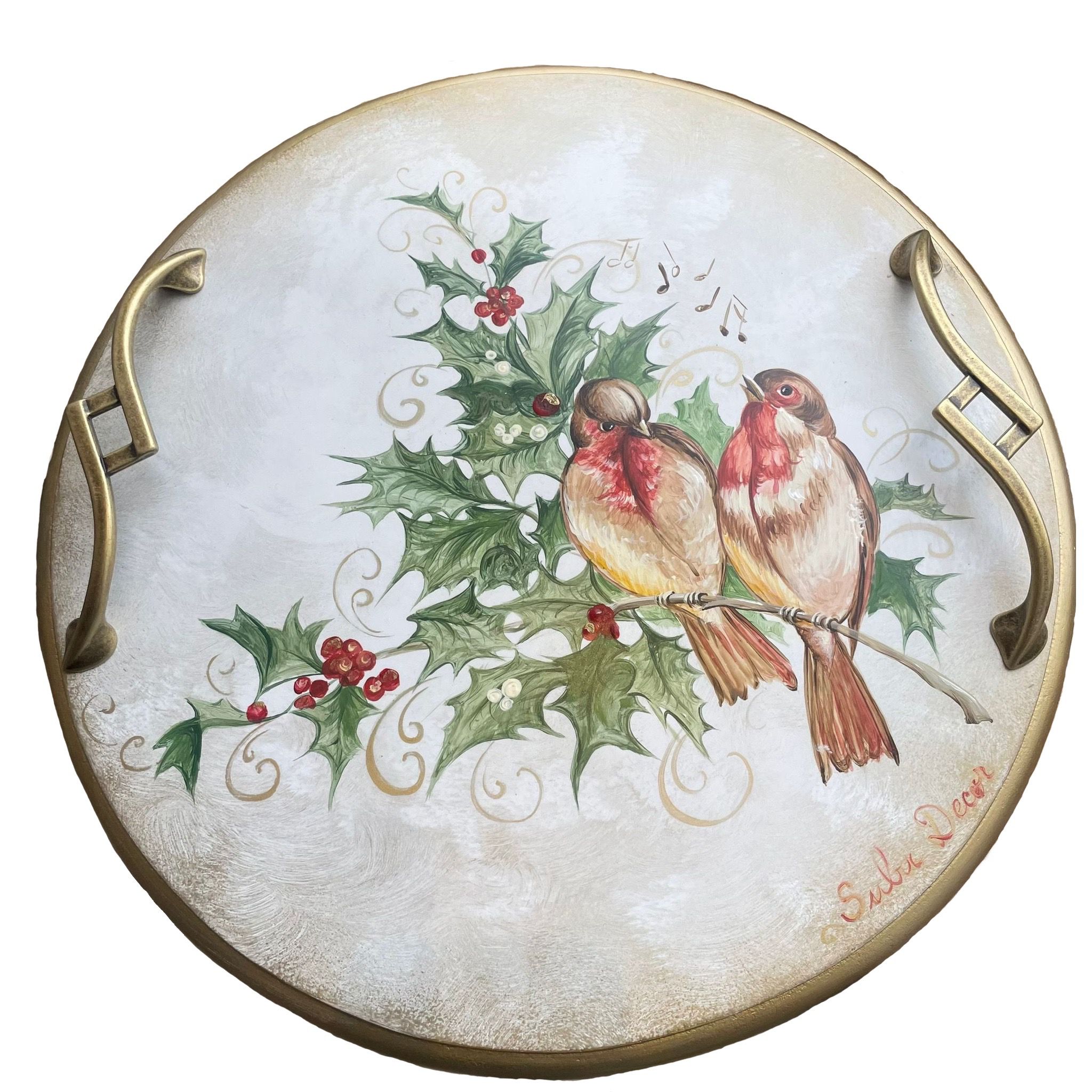 Tava din lemn pictata cu pasarele pe vasc.Totul este patinat si antichizat manual cu culori pe baza de apa.Este obiectul ideal pentru decorarea mesei de Craciun dar si pentru daruirea celor dragi,cadou ce va ramane in sufletele oamenilor. Are diametrul de 35 cm.