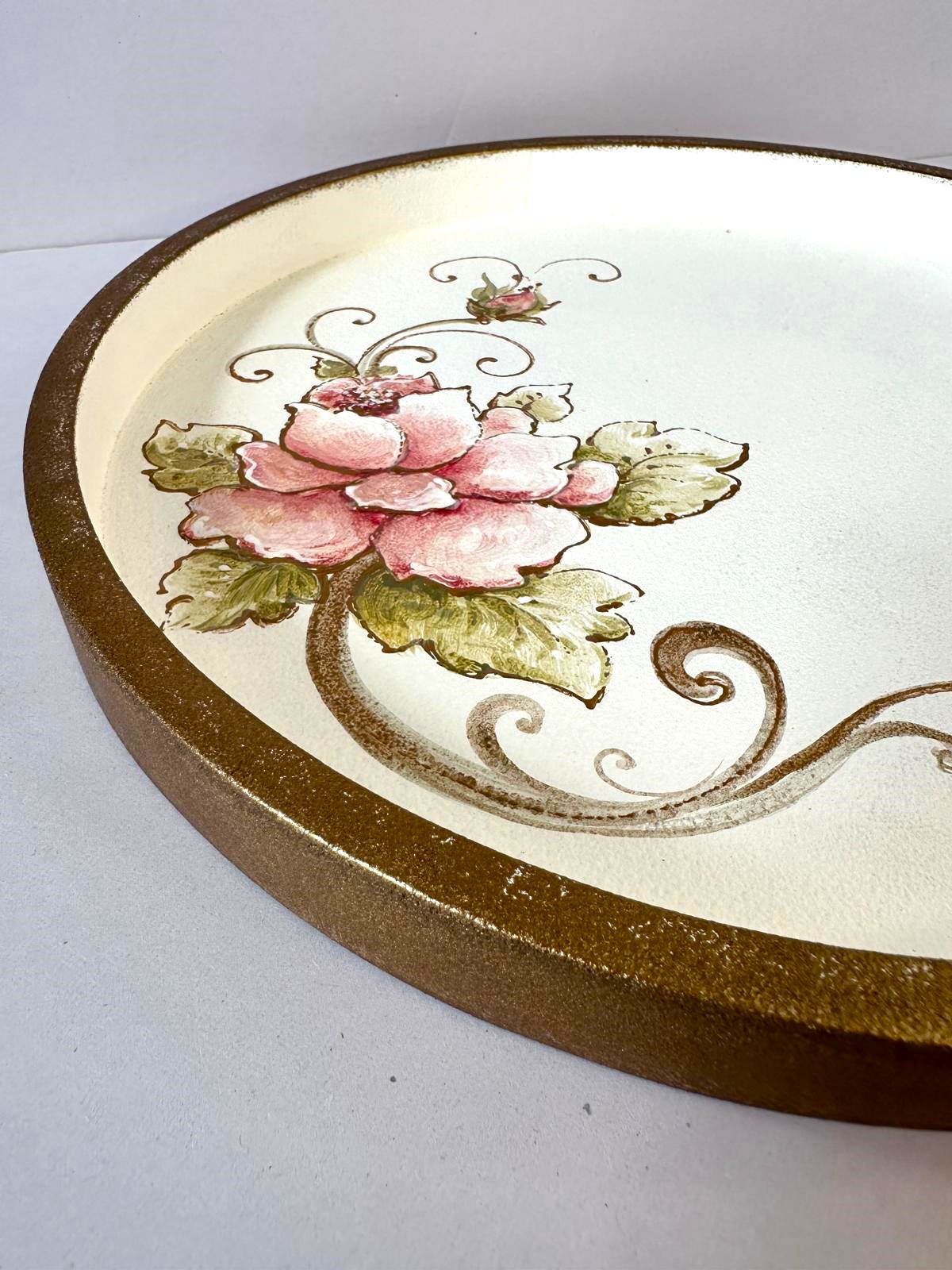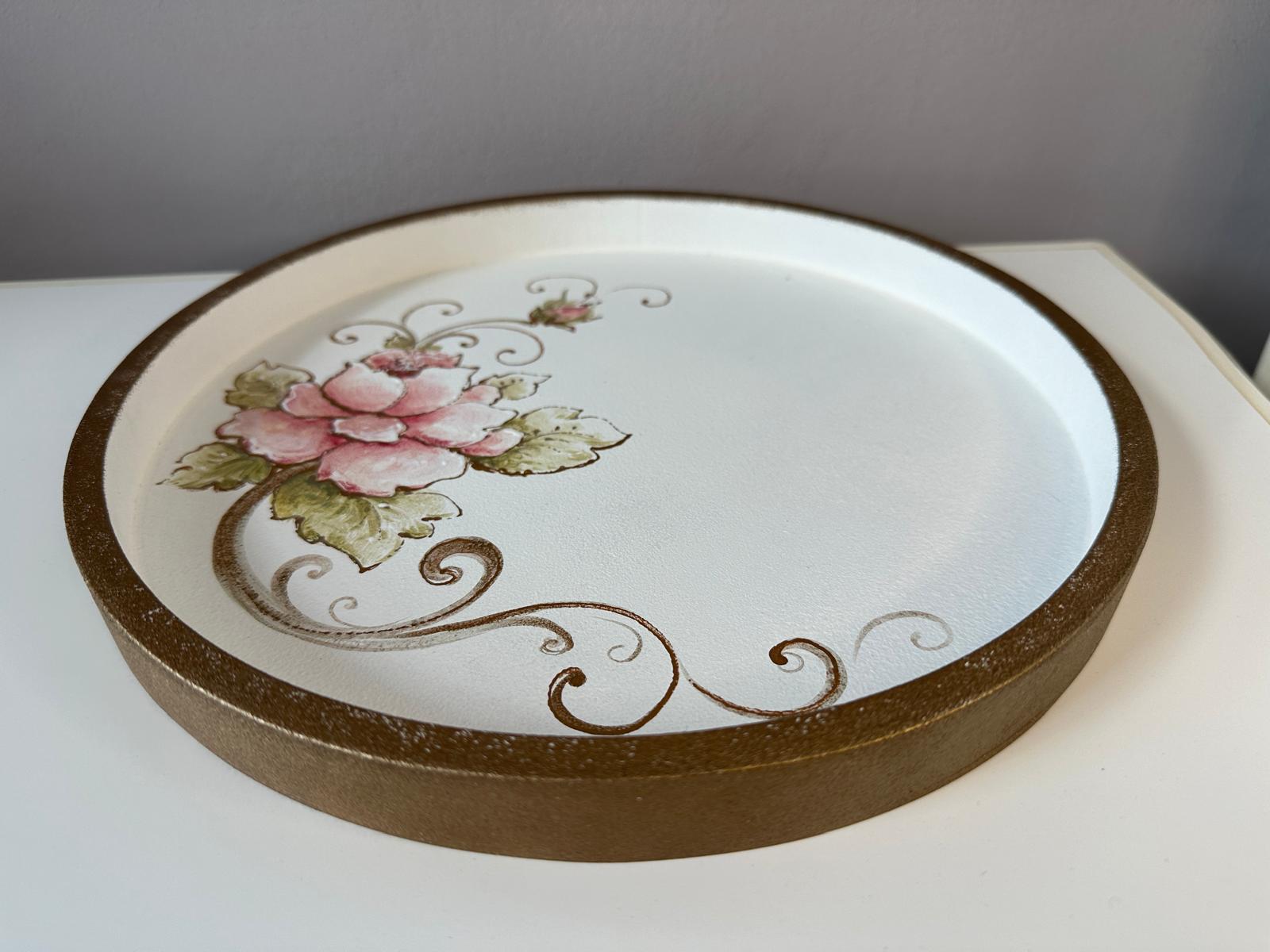 Tava din lemn cu bordura, pictat manual cu trandafir. Ideal pentru servit masa, ca suport pentru farfurie, tava pentru cafea, ceai sau desert, sau ca si decoratiune. Alaturi de o ceasca de cafea sau ceai, are un aspect minunat.