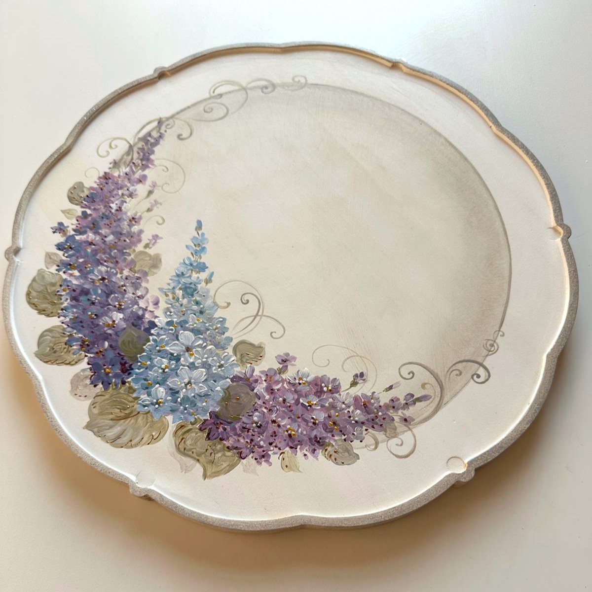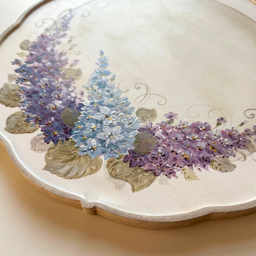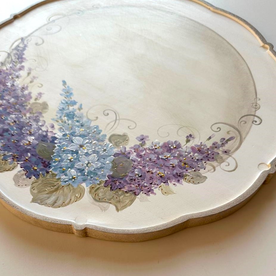 Tava rotunda pictata manual cu flori de liliac. Este realizata din lemn ,cu o bordura sculptata dantelata din lemn. Ideal pentru servit masa, ca suport pentru farfurie, tava pentru cafea, ceai sau desert, sau ca si decoratiune. Alaturi de o ceasca de cafea sau ceai, are un aspect minunat.