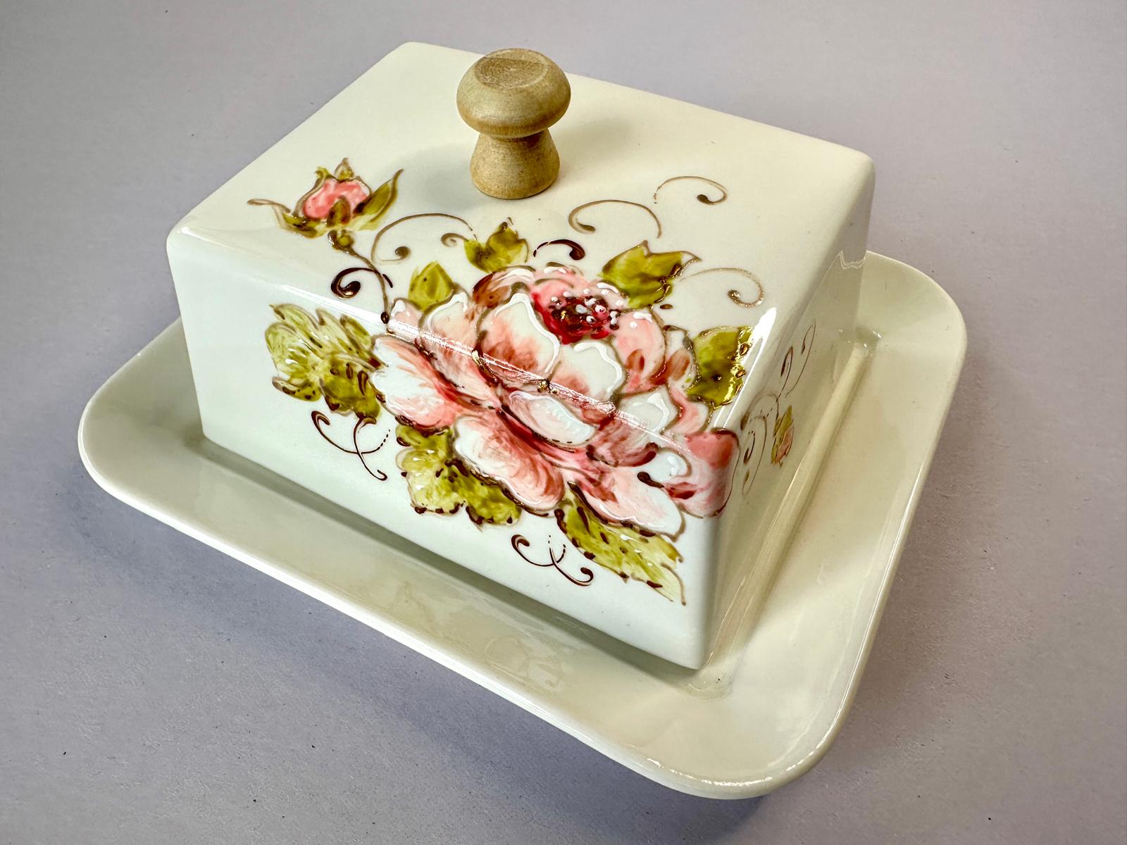 Untiera din portelan pictata manual cu trandafiria, ideala pentru depozitat unt. Realizata din portelan de calitate si pictat in atelierul nostru.