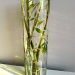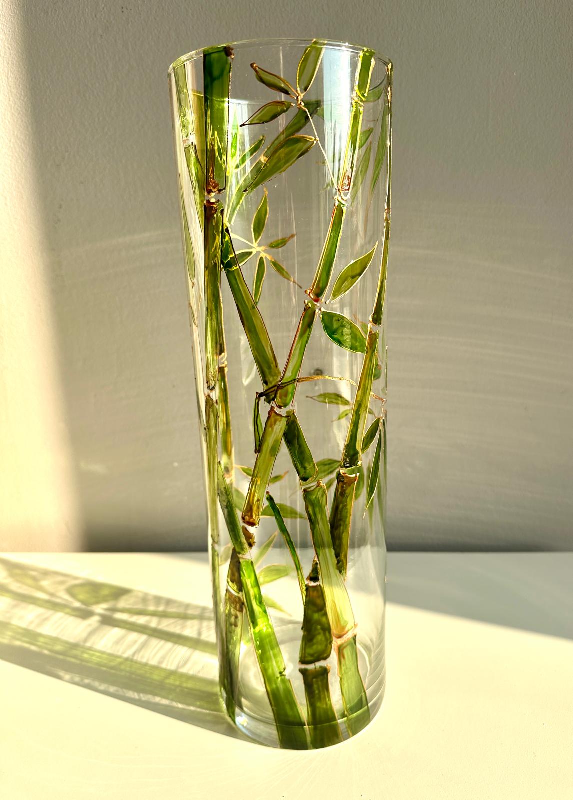 Vaza din sticla pictata manual cu bambus. Recipient ideal pentru flori, aduce frumusetea bambusului in casa ta. Pictura este realizata in culori rezistente, si nu se deterioreaza in timp. Dimensiiune 40cm inaltime, 12 cm latime.