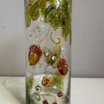 Vaza din sticla pictata manual cu tematica de toamna cu ghinde. Recipient ideal pentru flori, aduce frumusetea toamnei in casa ta. Pictura este realizata in culori rezistente, si nu se deterioreaza in timp.
