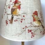 Veioza pictata manual, cu pasarele ce stau pe crengute, acoperite de zapada si cu caciulite. Abajurul este textil, pictat in culori de inalta calitate, rezistente in timp. Piciorul este metalic, auriu, usor patinat cu brun-roscat ca sa ii ofere un aspect vintage.