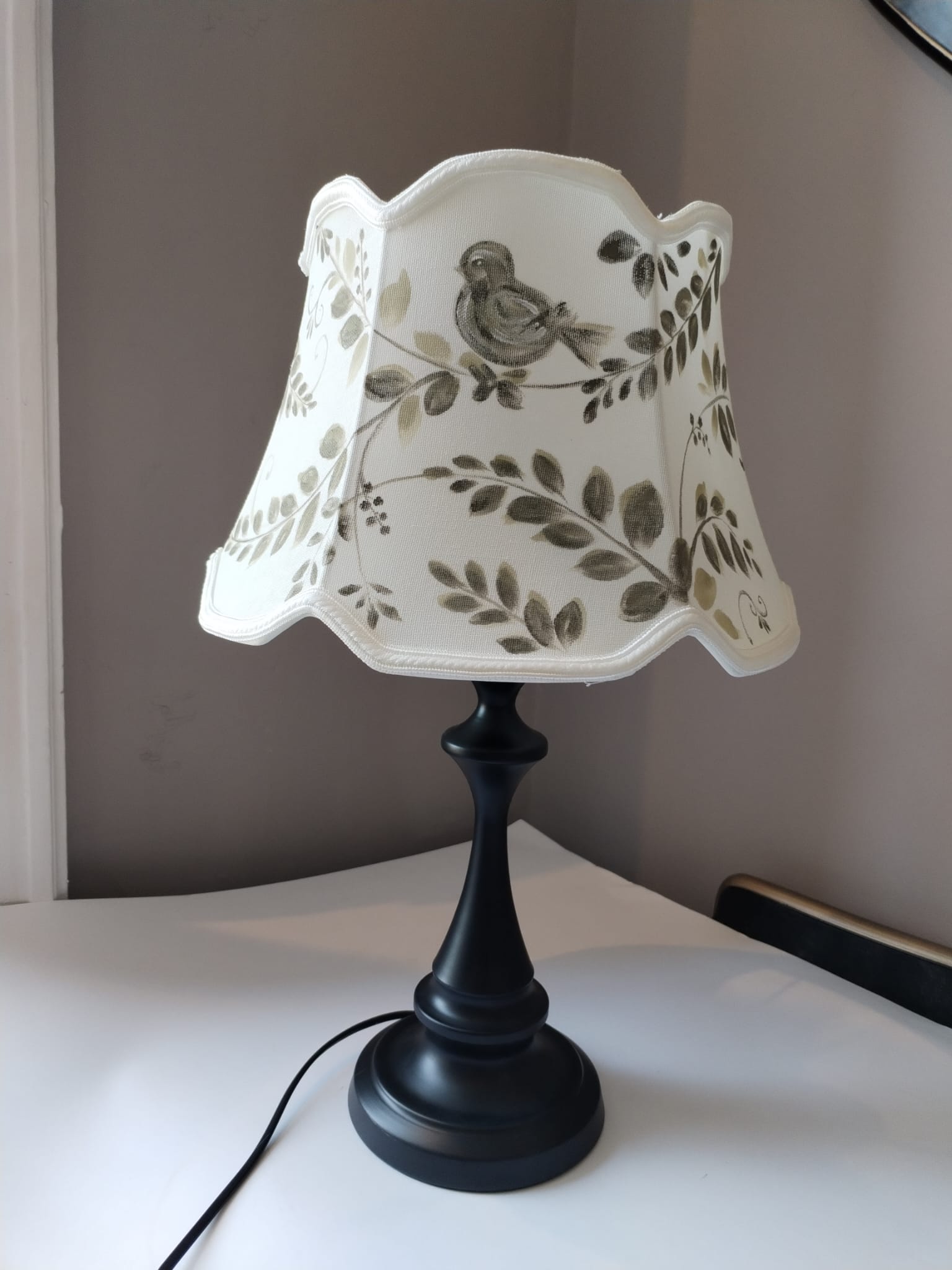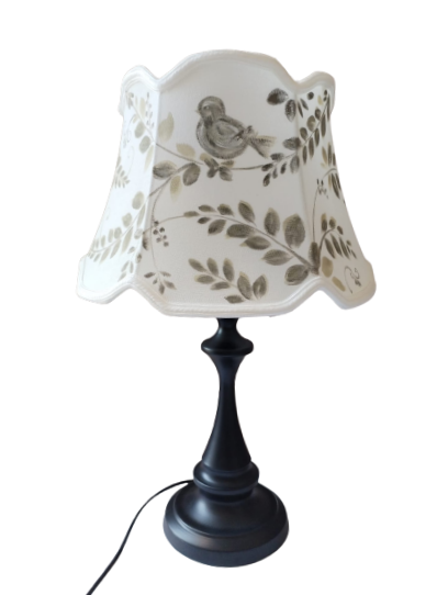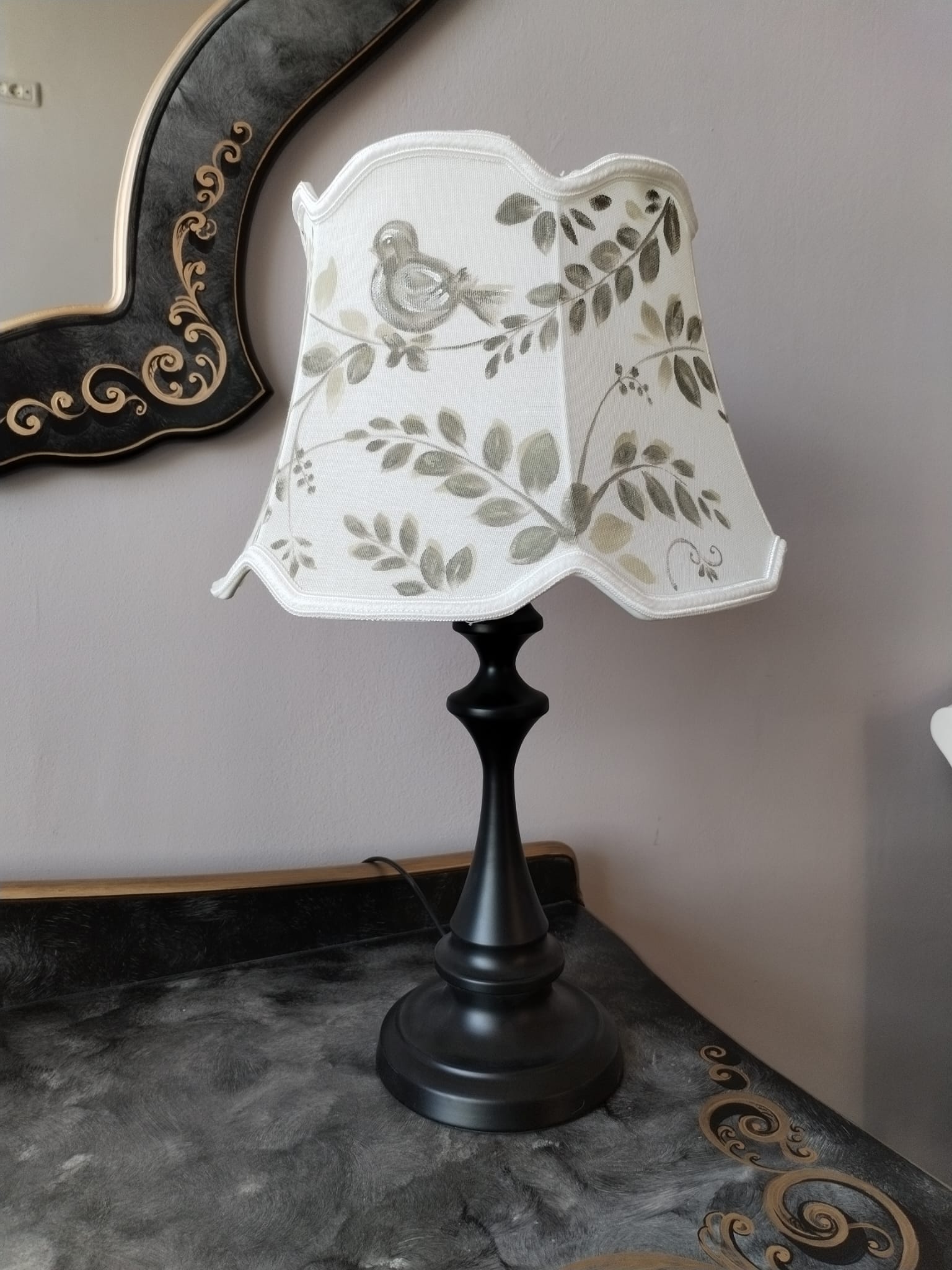 Veioza cu picior metalic, cu abajur pictat manual cu pasari pe crengute, in nuante de verde inchis. Foarte decorativa si utila, aduc un aspect elegant in dormitorul dvs. Are inaltimea de 50 cm