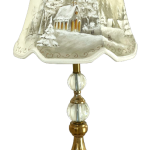 Veioza cu abajur de panza, pictat manual cu peisaj de iarna. Are picior metalic cu decoratiuni de sticla. Pictat manual in atelierul Suba Decor. Are inaltimea de 64cm.