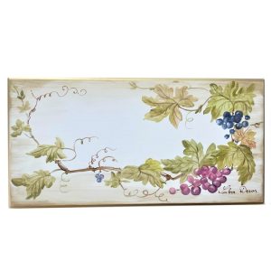 decoratiune sau platou dreptunghiular, pictat manual cu vită de vie, patinat, cu margine aurie și dimensiunile de 25×50 cm